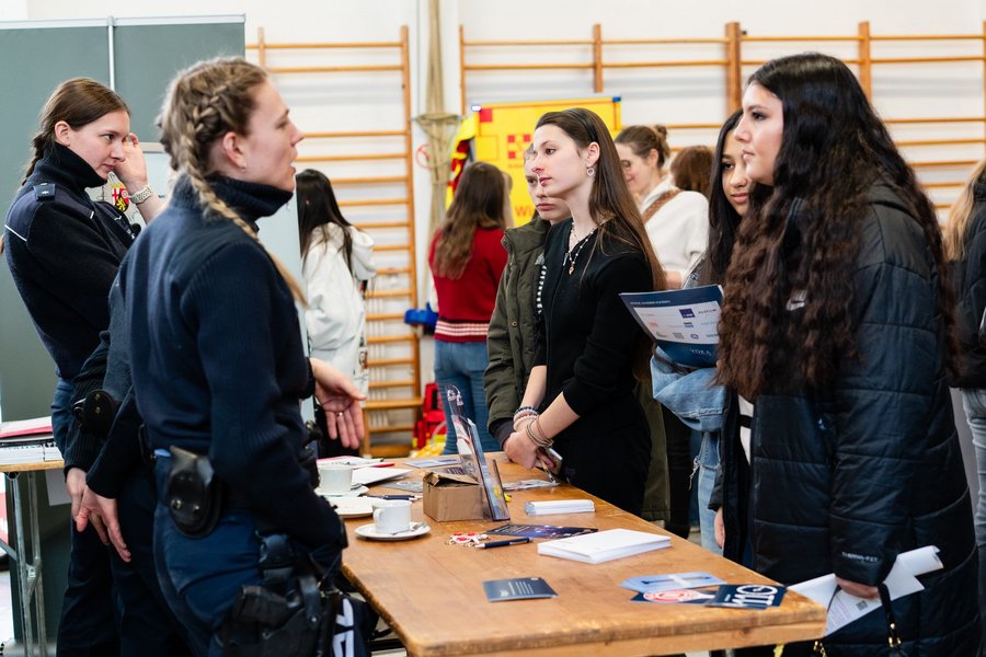 In der neuen Turnhalle präsentierten sich rund 50 regionale und überregionale Unternehmen aus unterschiedlichsten Berufsfeldern. In persönlichen Gesprächen erhielten die Schülerinnen die Möglichkeit, direkt mit Firmenvertreterinnen und -Vertretern in Kontakt zu treten, Unternehmen kennenzulernen und sich umfassend über Ausbildungs- und Studienmöglichkeiten zu informieren. Ziel der Messe war es, erste berufliche Kontakte zu knüpfen und Orientierung für den eigenen beruflichen Weg zu bieten.